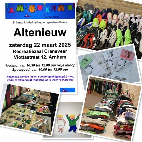 Op zaterdag 22 maart organiseert ‘Altenieuw’ een tweedehands kinderkleding- en speelgoedbeurs in recreatiezaal Craneveer en basisschool De Zyp, aan de Viottastraat in Arnhem Noord.