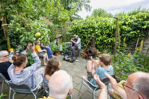 hand en zonnebrand op het gezicht, ontmoetten bezoekers de buren bij de optredens. Van ontroerende singer-songwriters tot wervelende