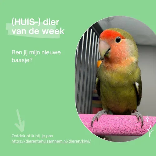 Maak kennis met Kiwi, een vrolijke en spraakzame Agapornis die op zoek is naar een warm nieuw thuis, het liefst samen met één of meerdere soortgenootjes.